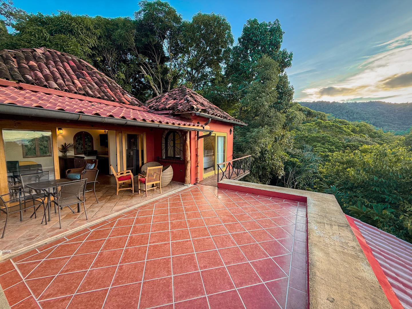 Immersed in a true natural paradise and just minutes from the beaches of Dominical and Uvita, this stunning villa offers the perfect blend of ocean and jungle views. The spacious property includes a two-bedroom, 2.5-bath main residence and a two-bedroom, two-bath guesthouse, separated by 15 yards of vibrant tropical gardens for added privacy. The main home features a 180° wrap-around deck, ideal for savoring sweeping ocean vistas and unforgettable sunsets.